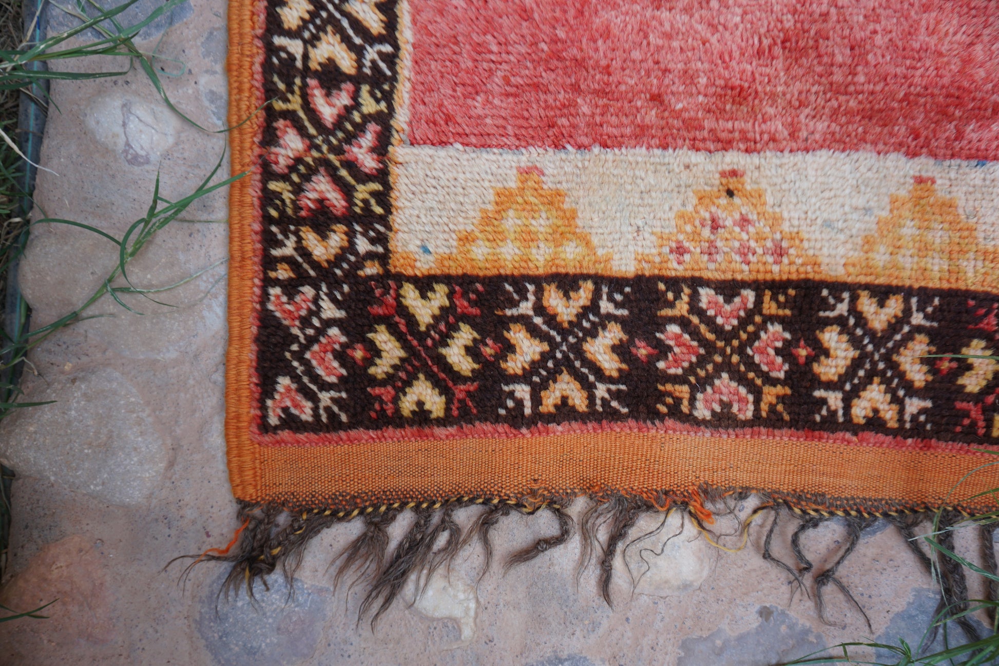 Aunque la artesana Fátima ahora administra la cooperativa familiar, esta alfombra vintage fue elaborada por las hábiles manos de su madre. Esta alfombra lleva consigo un legado de calidez y resiliencia, que representa la devoción compartida de Fátima y su madre por el arte del tejido, combinando experiencia, tradición y amor.