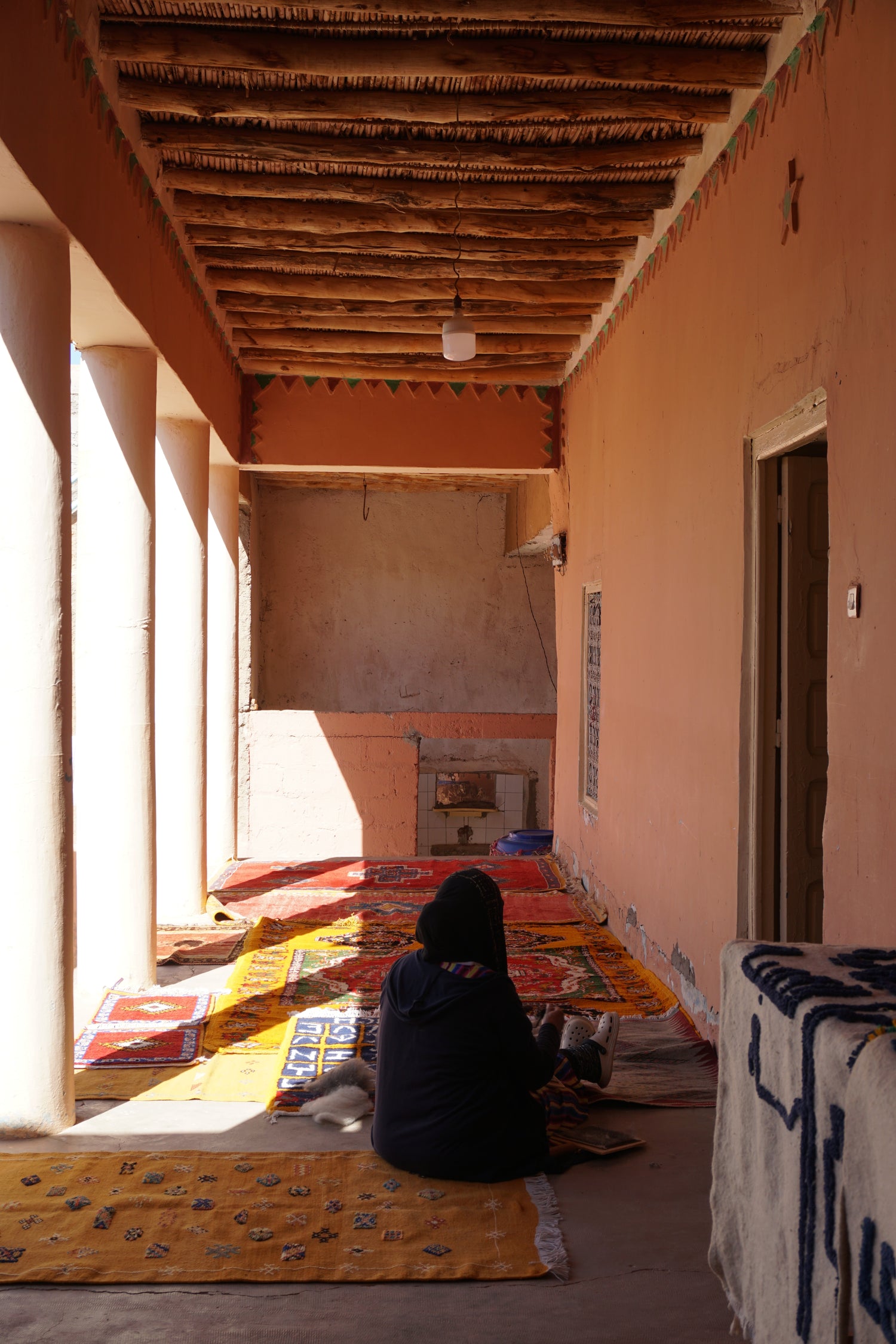 Esta alfombra, tejida por la madre de Fátima, una artesana experta, tiene una profunda historia de calidez y resiliencia. Fátima, que en su día fue aprendiz de su madre, ahora asume el papel de matriarca dentro de la familia. Esta pieza es un testimonio de su devoción compartida por la artesanía, donde la tradición, la experiencia y el amor se entrelazan en cada hilo.